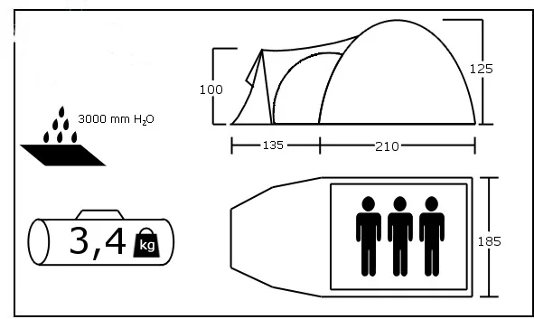• Размер в собранном состоянии: 135 + 210 х 185 х 125/100 см