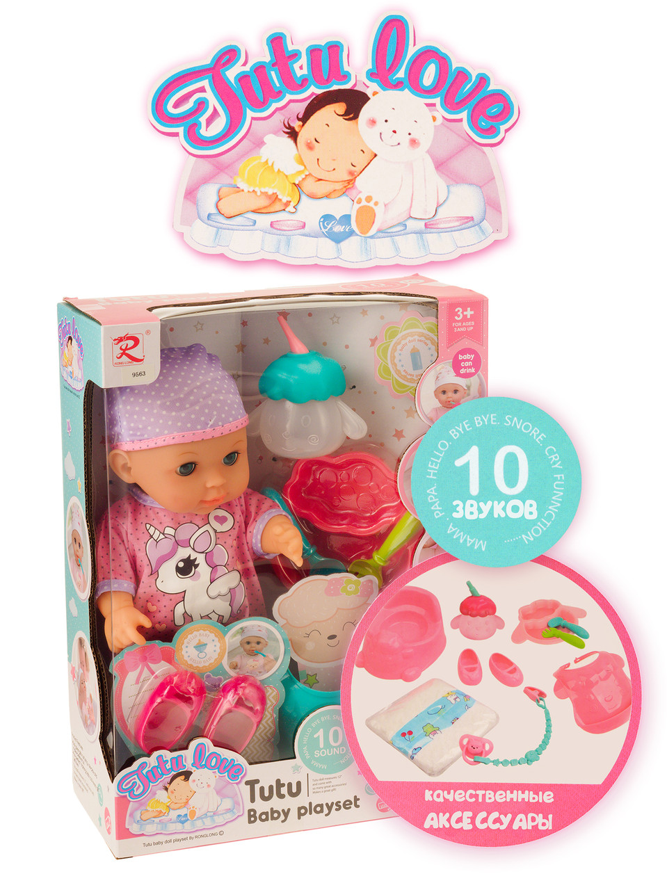 • Комплектность: пупс, нагрудник, бутылочка, тарелочка, ложка, вилка, туфельки
