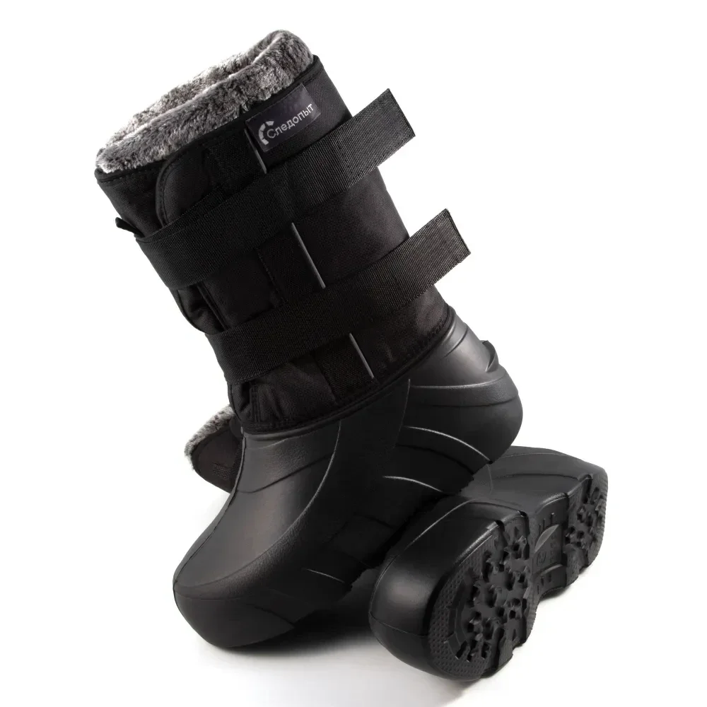 Сапоги-дутики мужские «СЛЕДОПЫТ» - зимние сапоги на липучке для города и прогулок на природе. Эргономичная, удобная и очень практичная обувь не боится ни грязи, ни воды, хорошо переносит перепад температур. В изготовлении применяется морозоустойчивый материал ЭВА, который сохраняет тепло благодаря пористой структуре. Сапоги комплектуются 4-слойным вкладышем из полушерсти. Внутренняя поверхность чулка имеет ворсистую структуру для сбора конденсата – спандбонд. Фольга на внешней стороне вкладыша создаёт эффект термоса и позволяет поддерживать комфортную температуру, сохраняя ноги в тепле.